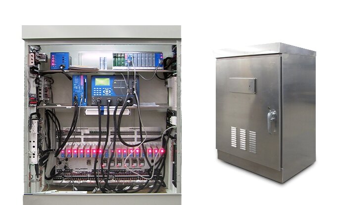 Stainless steel enclosure mounted on poles for space efficiency. It provides secure housing for controllers, protecting against weather and vandalism.
